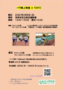 パラ陸上教室in TOKYO 2026年3月8日(日)に東京・世田谷区立総合運動場で「2026パラ陸上教室in TOKYO」を開催いたします。 たくさんの方々のご参加をお待ちしています。参加希望の方は要項をご確認いただきお申込みください。 陸上教室要項 この事業は、、公益財団法人 日本財団パラスポーツサポートセンター助成金で実施しています。 |